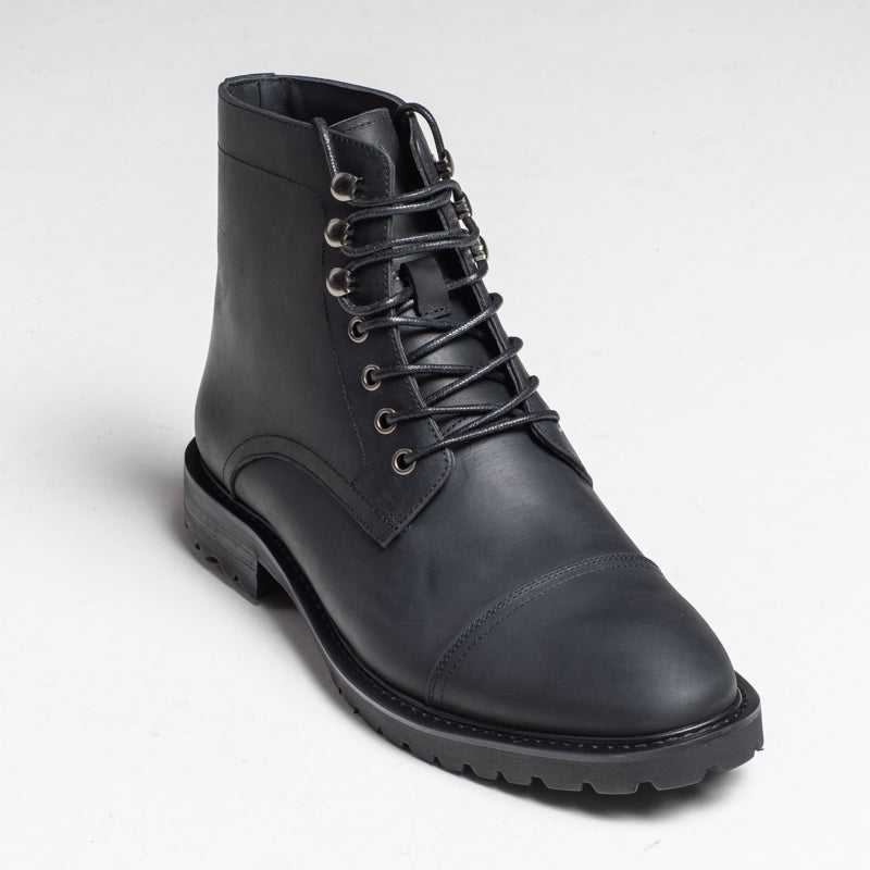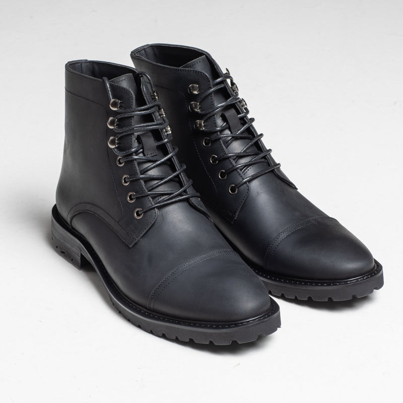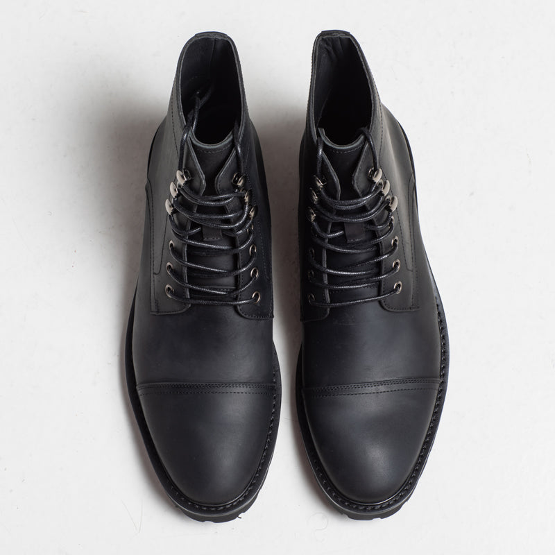 A bold minimalist essential. Crafted from matte black leather, this boot delivers a clean, structured look with a sharp cap-toe finish. The polished hardware and streamlined silhouette make it easy to pair with both casual and smart outfits.
