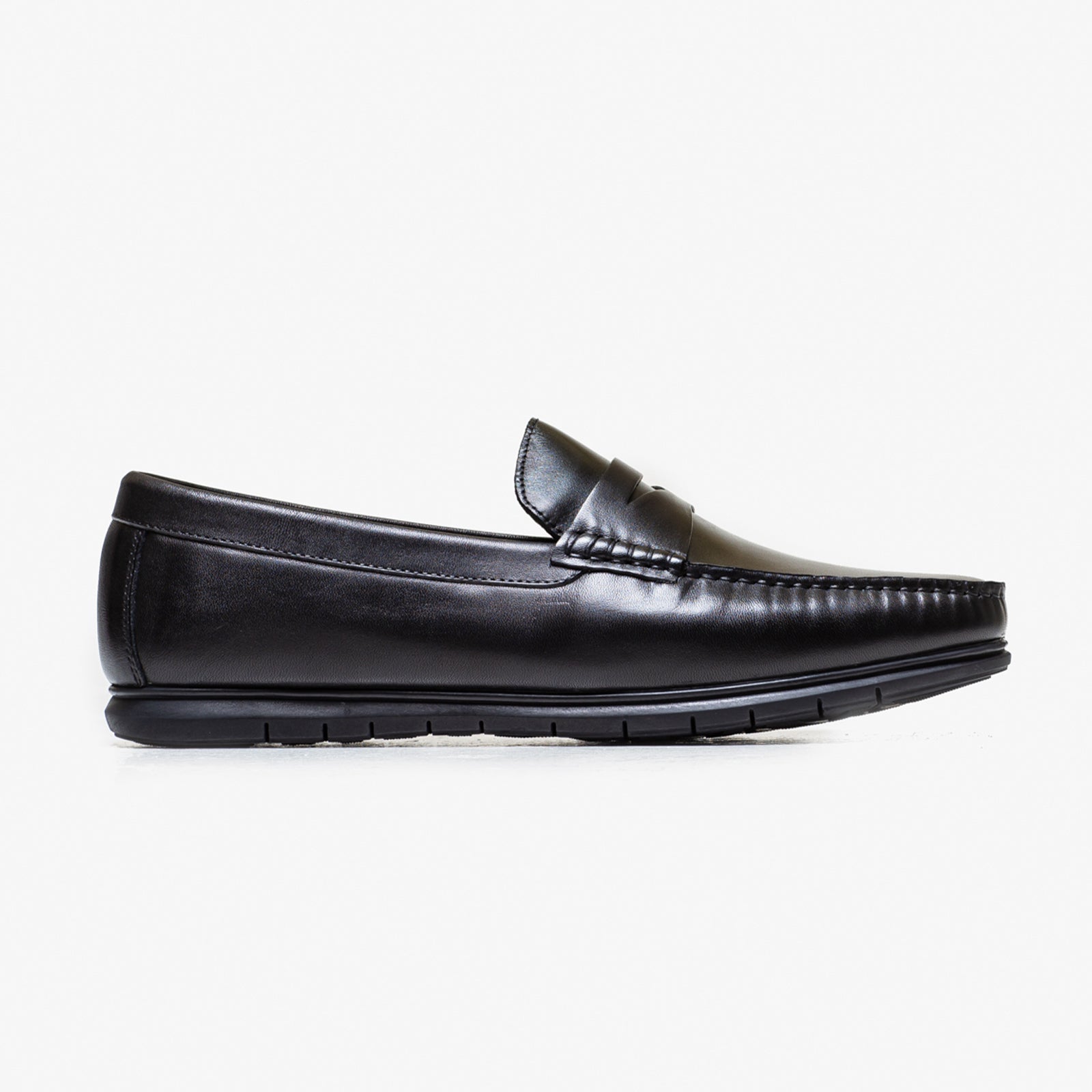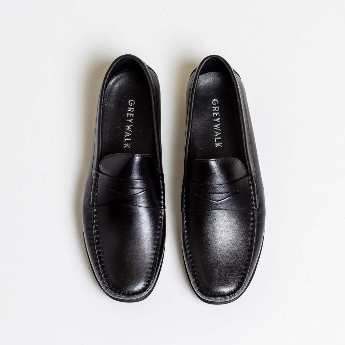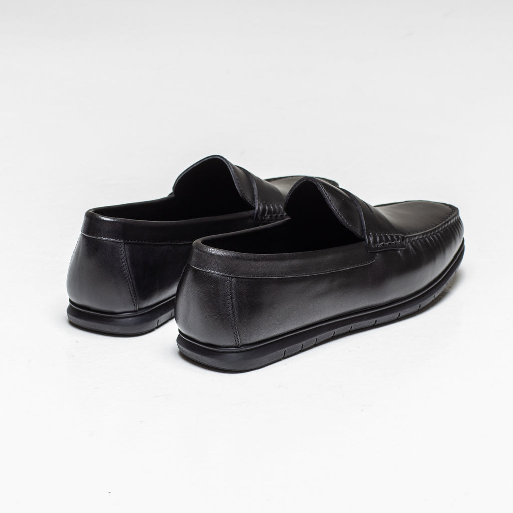 This handmade driving loafer is made from black calf leather with a smooth, polished finish. The upper includes a penny strap detail and hand-stitched moc toe, giving it a clean and classic look.