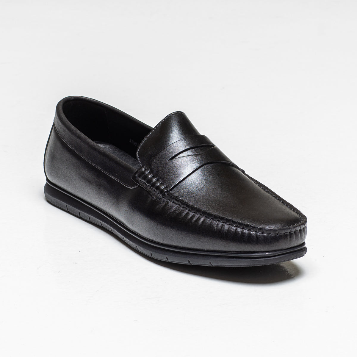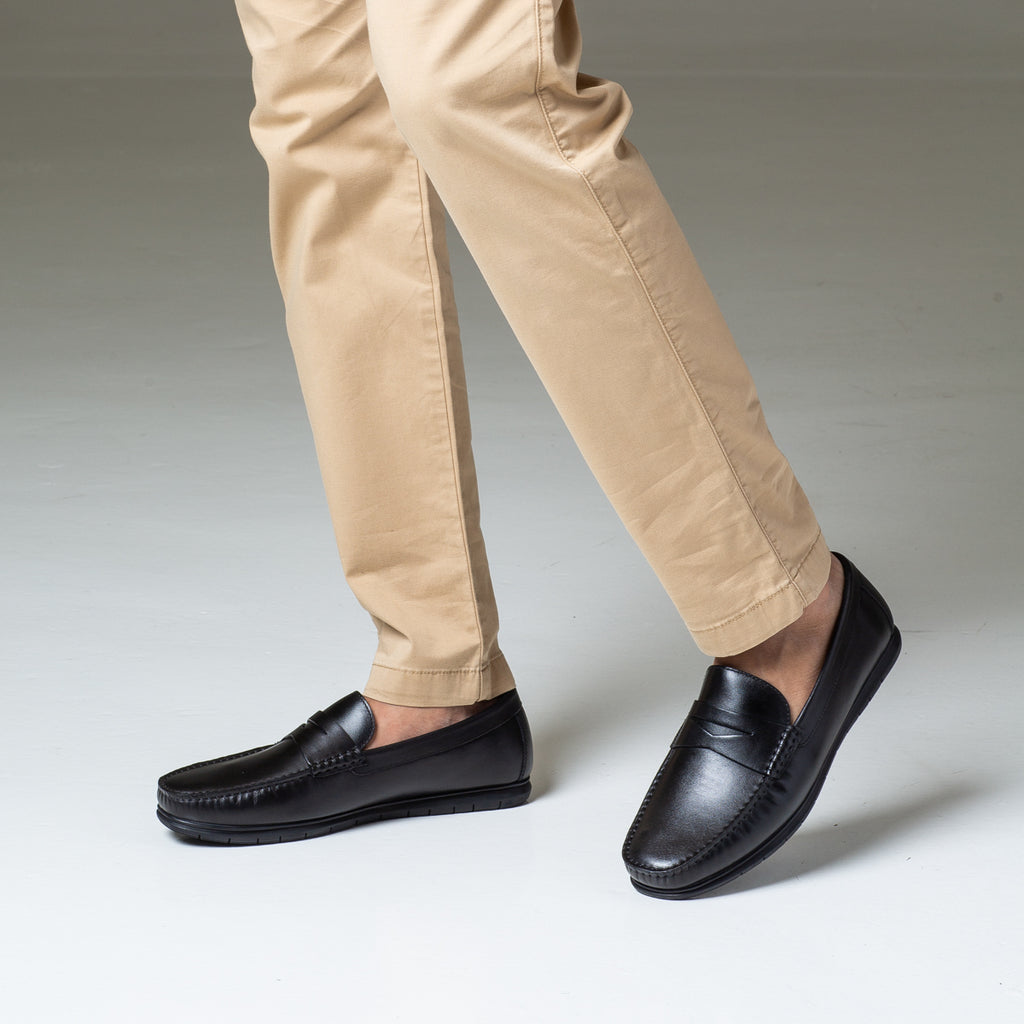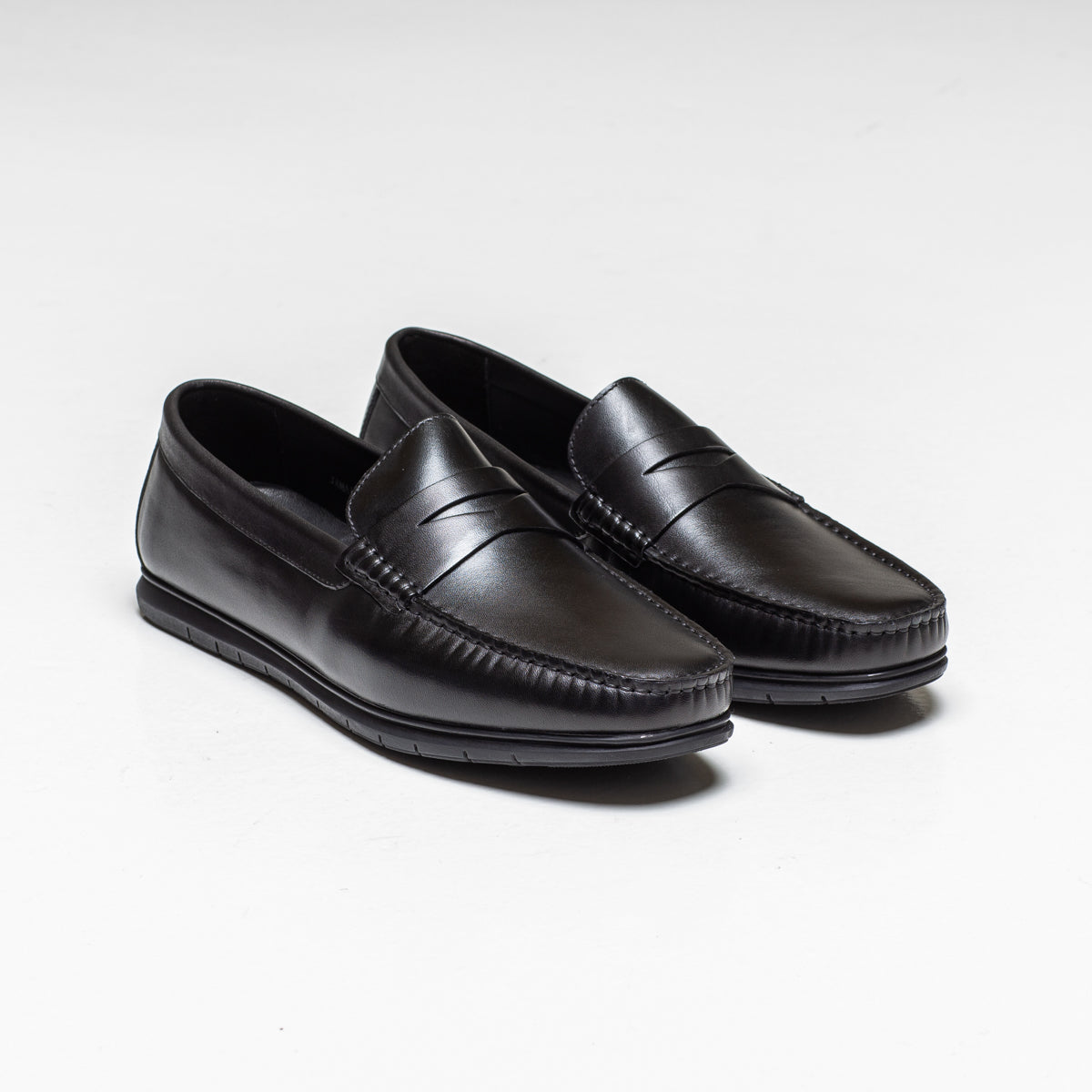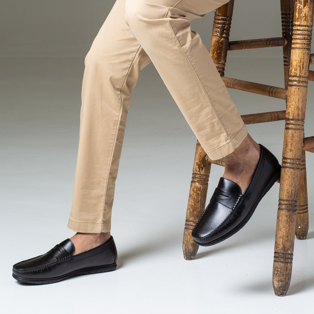 This handmade driving loafer is made from black calf leather with a smooth, polished finish. The upper includes a penny strap detail and hand-stitched moc toe, giving it a clean and classic look.