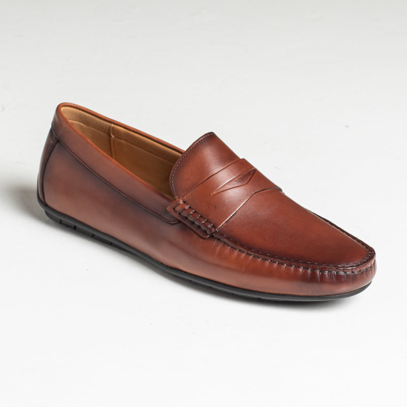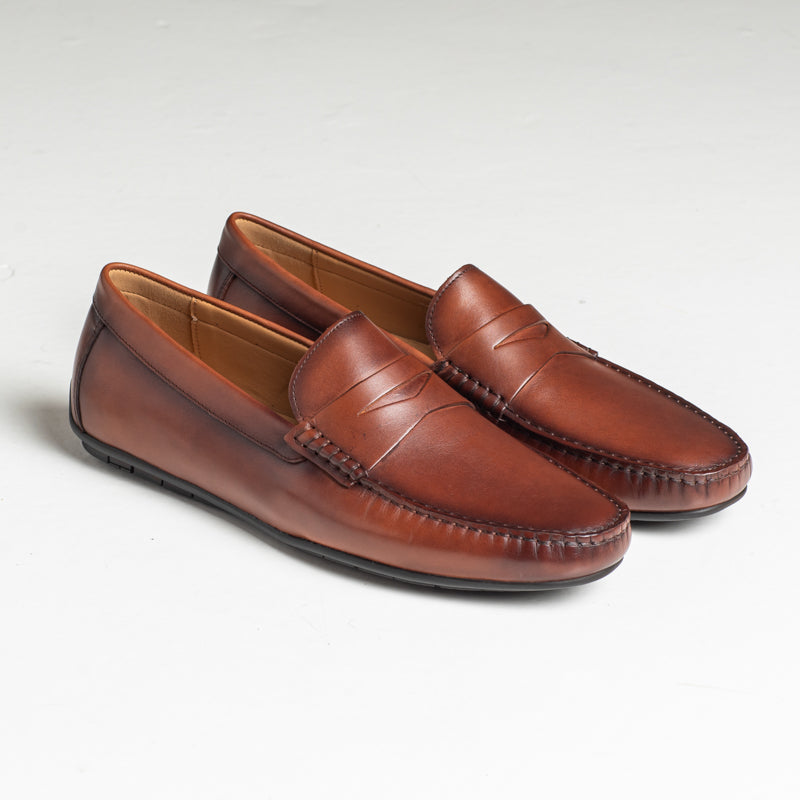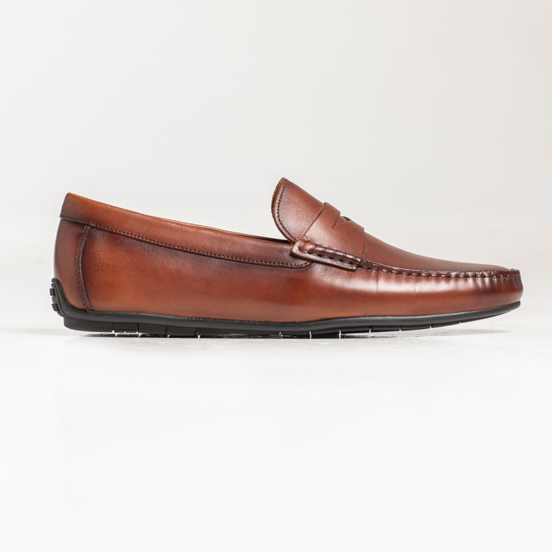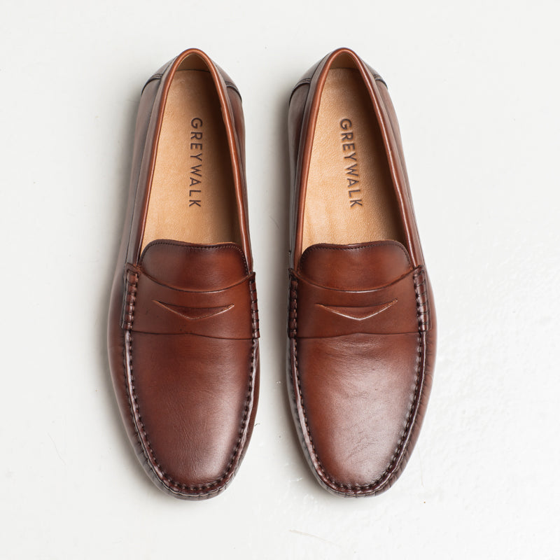 This handmade driving loafer is made from brown calf leather with a smooth, hand-finished surface. The upper features a penny strap detail and hand-stitched moc toe, keeping the design simple and classic.