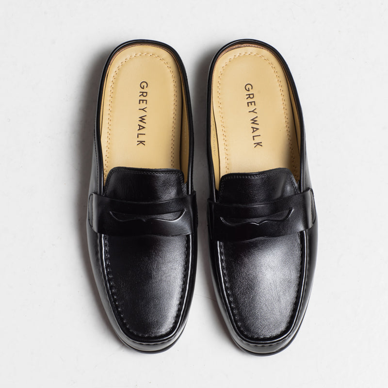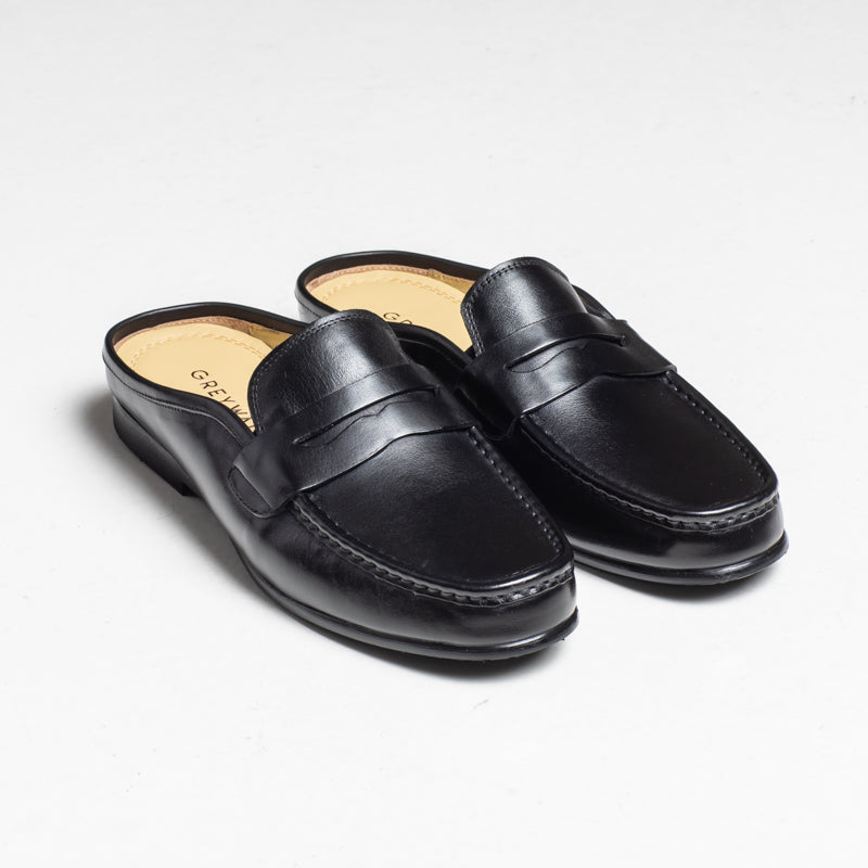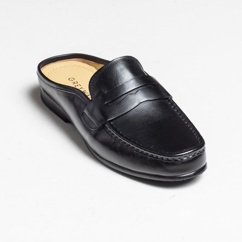 A clean penny-style mule crafted in smooth black leather. Jasper offers an easy slip-on design with a classic apron stitch and a neat, minimal profile. A versatile option for relaxed smart-casual wear.