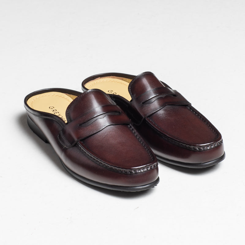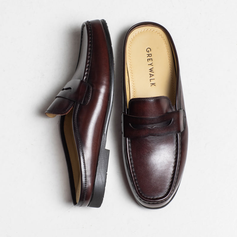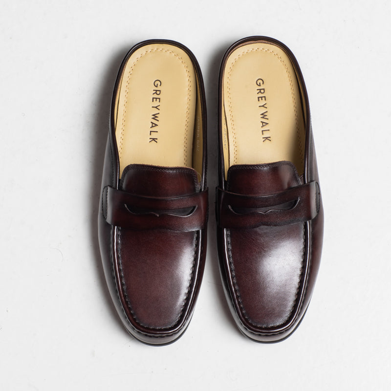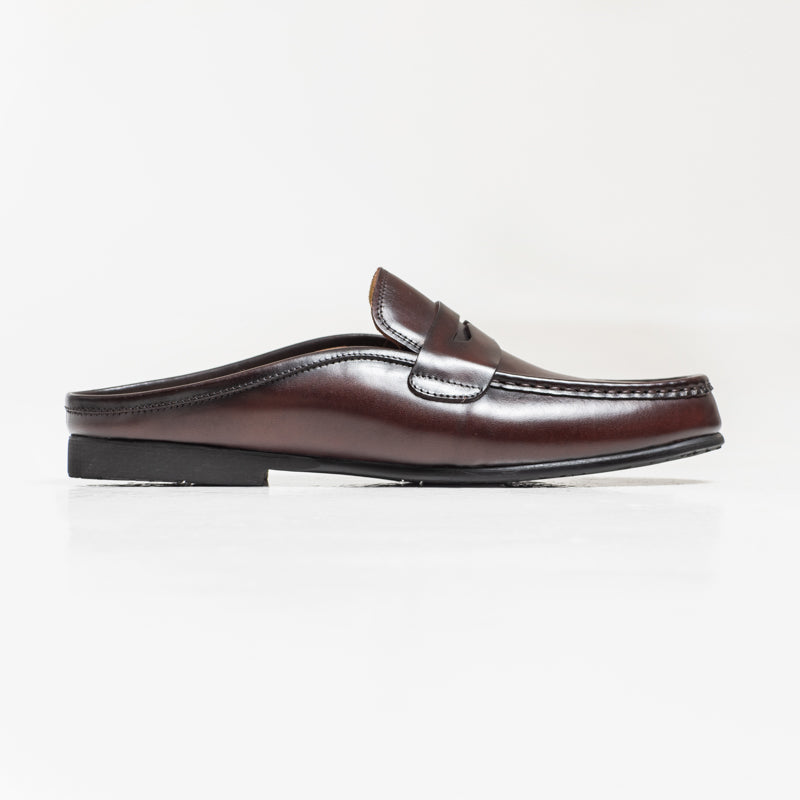 A slip-on mule loafer made in rich brown leather, featuring a classic penny-strap finish and apron stitching. The open-back design is paired with a durable rubber sole for practical, everyday wear.