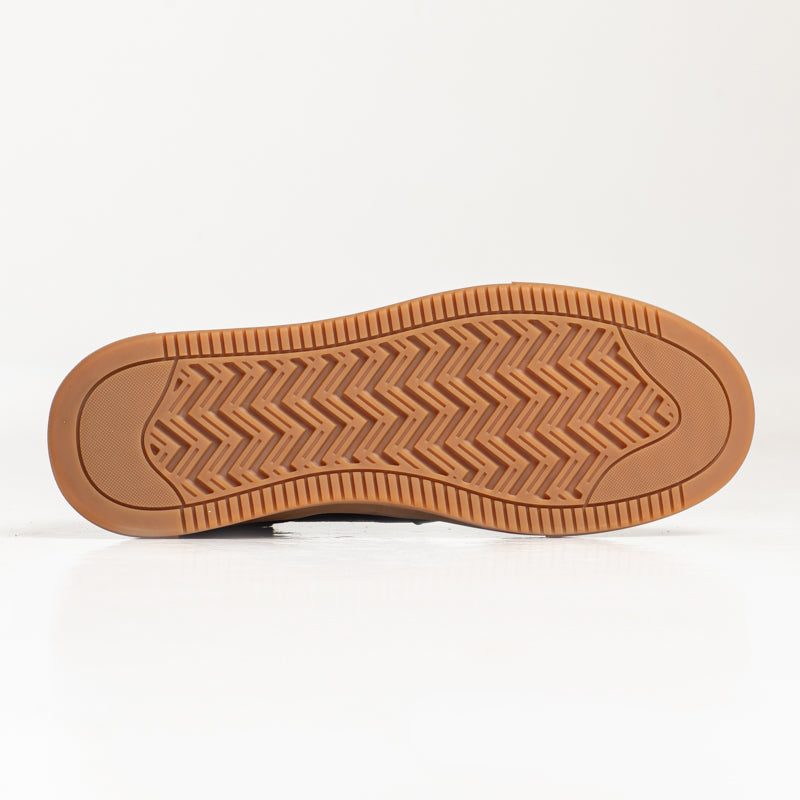 It features a stitched leather upper, tonal laces, and a tan rubber sole that complements the overall design. The interior is finished with leather lining, focusing on quality materials and solid construction.