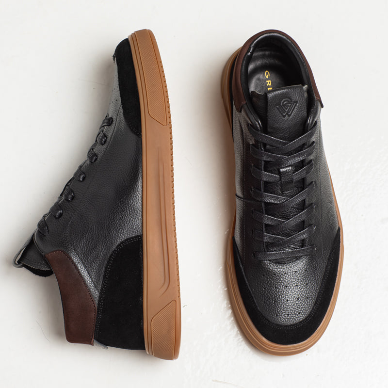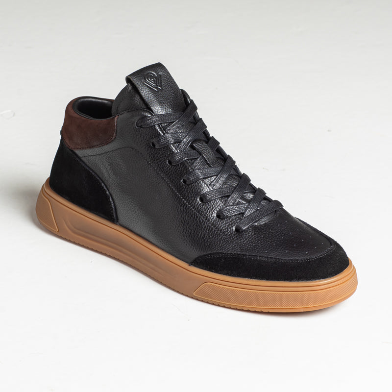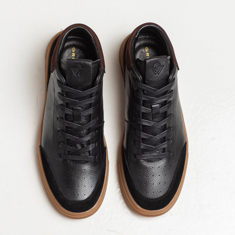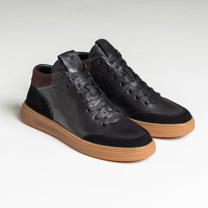 This handmade mid-top sneaker is made from black calf leather with suede detailing at the toe and heel. The combination of smooth and textured finishes adds depth without drawing too much attention.