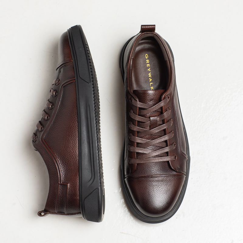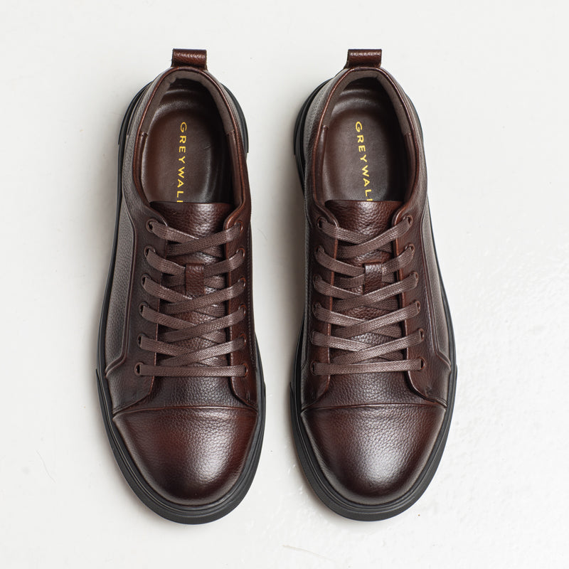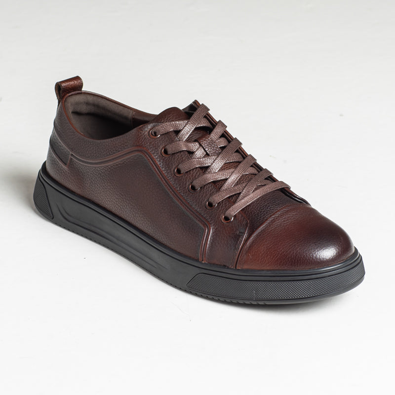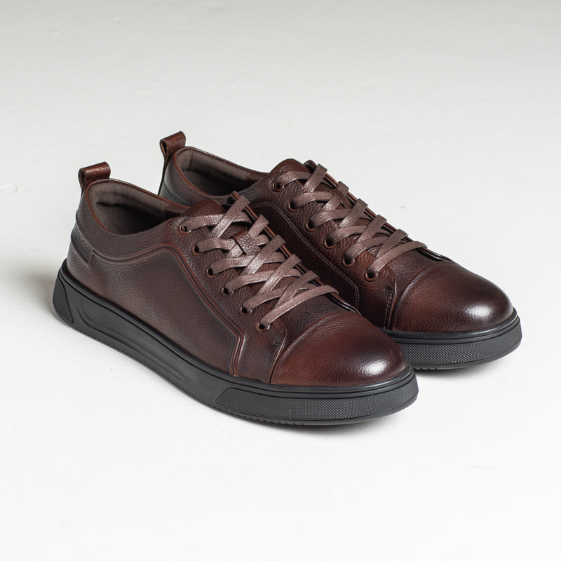 This sneaker is crafted from textured brown calf leather with a focus on simplicity and contemporary design. The upper combines smooth and pebbled leather panels, complemented by tonal laces and a black rubber sole that adds contrast and structure.