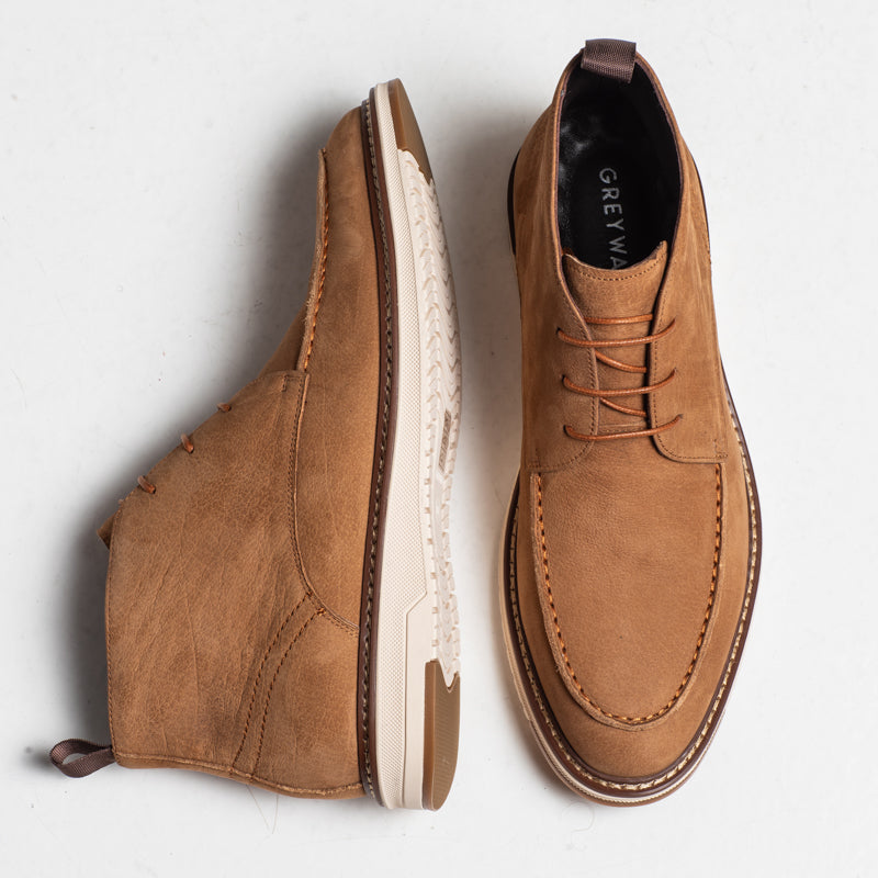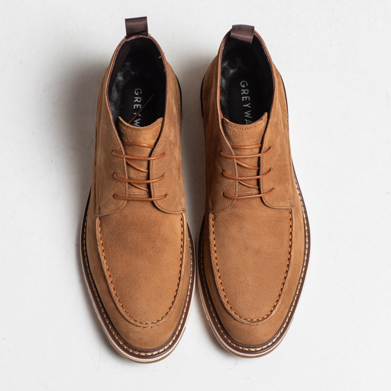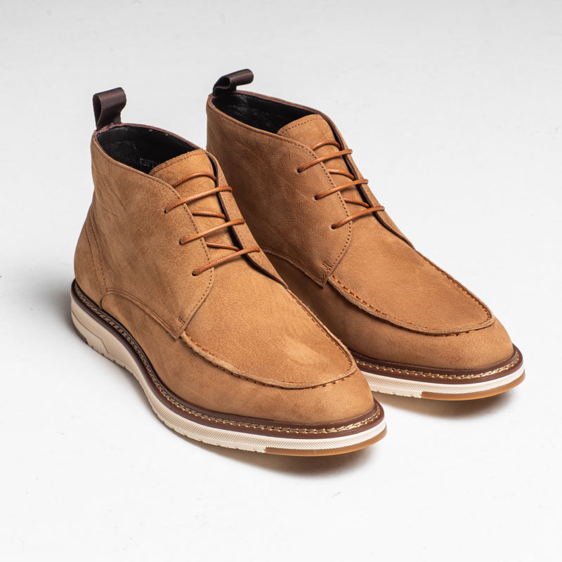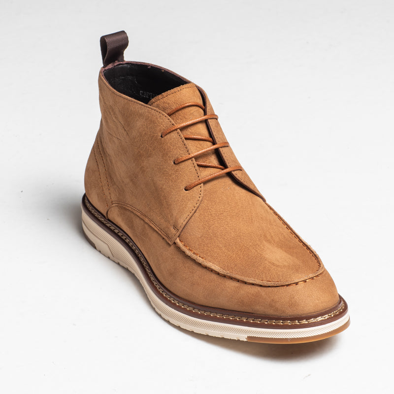 A handmade chukka-style boot crafted in soft tan nubuck leather. Captain features a clean moc-toe design, minimal stitching, and a contrasting rubber sole for a modern casual look.