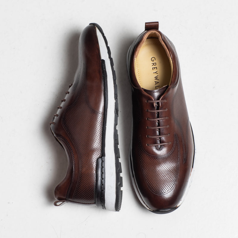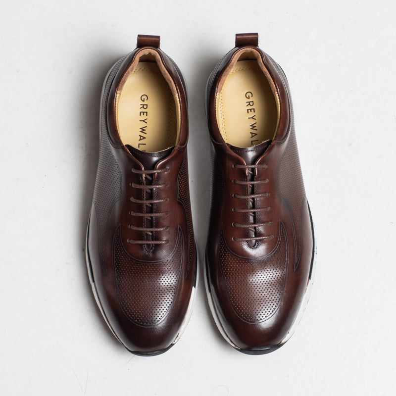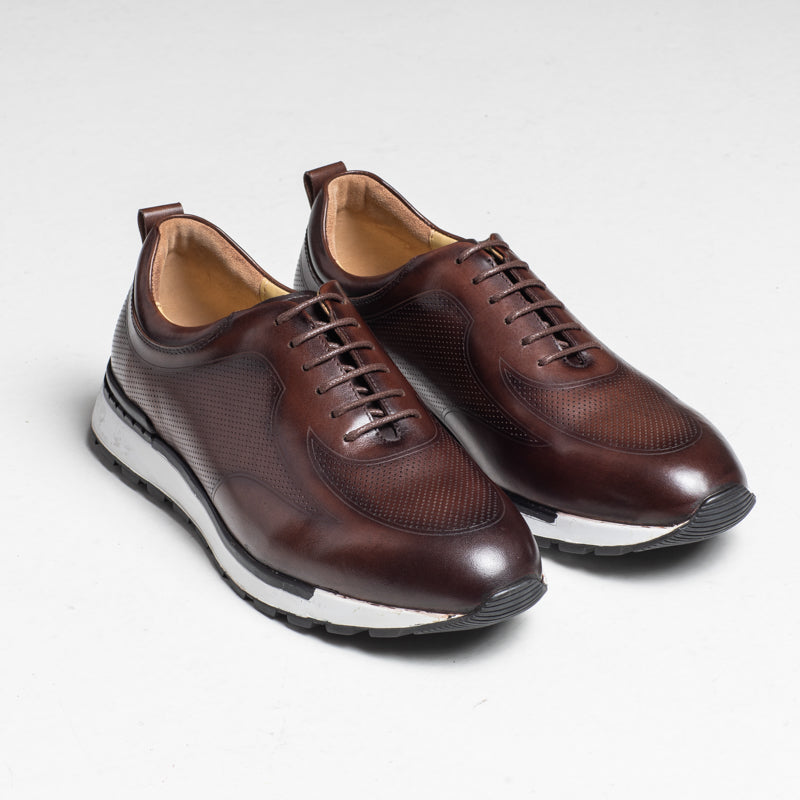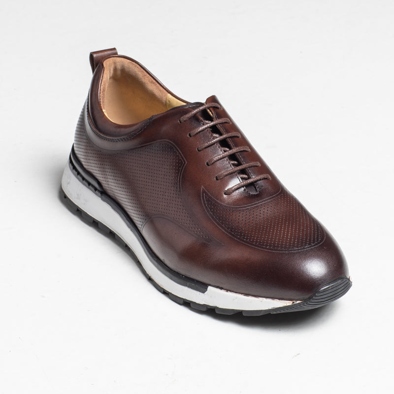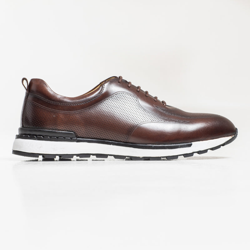 A clean and polished leather trainer in a rich brown finish. The perforated design adds a modern touch, while the rubber sole keeps the shoe comfortable throughout the day. A great choice for casual and smart-casual outfits.