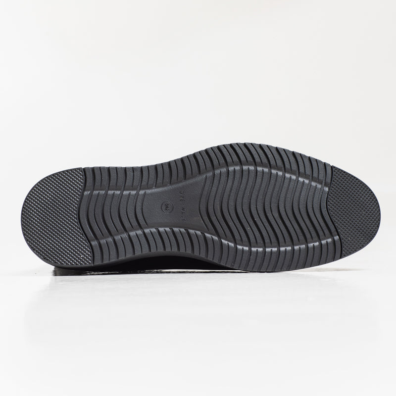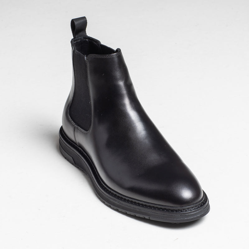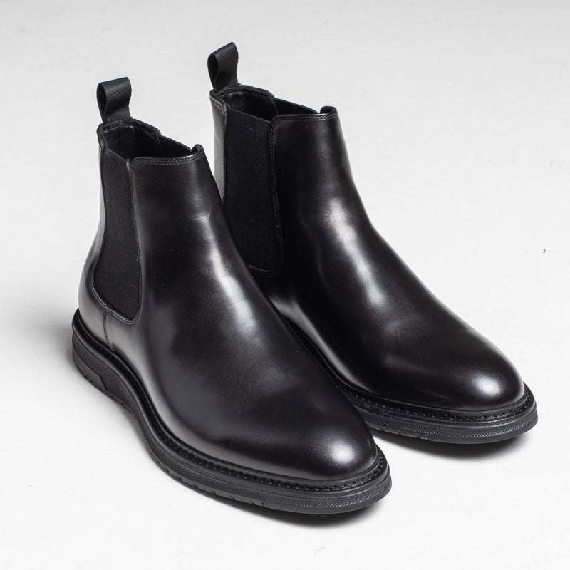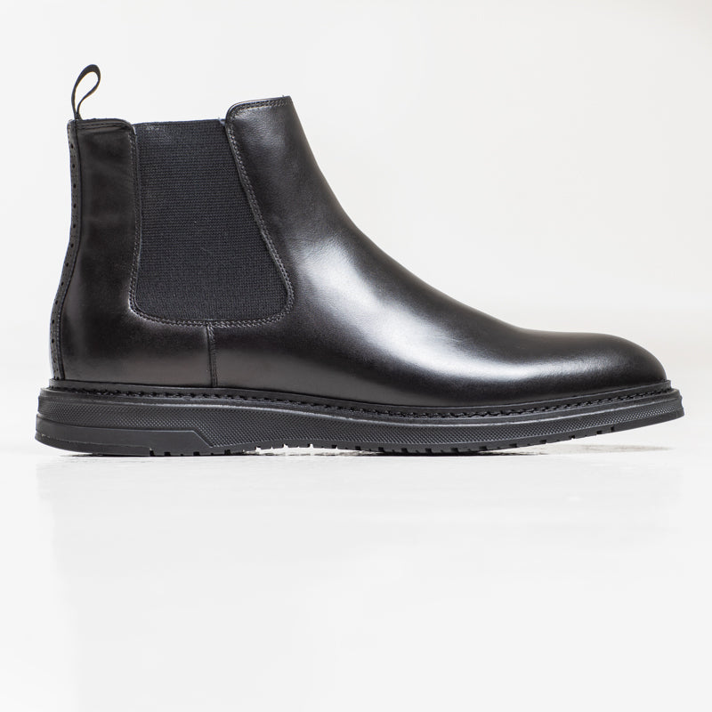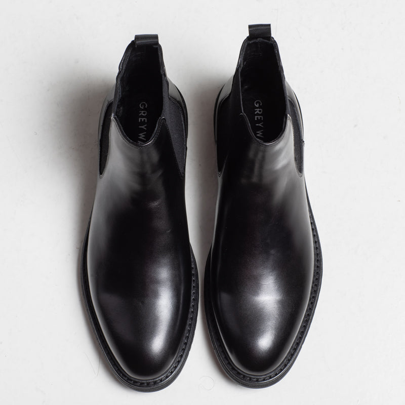A handmade Chelsea boot in smooth black leather with a neat silhouette. Designed with elastic side panels and set on a lightweight rubber sole, offering a clean and versatile style.