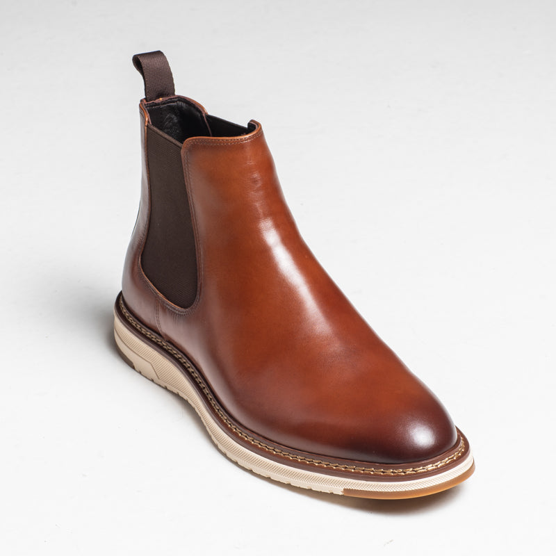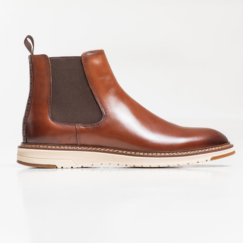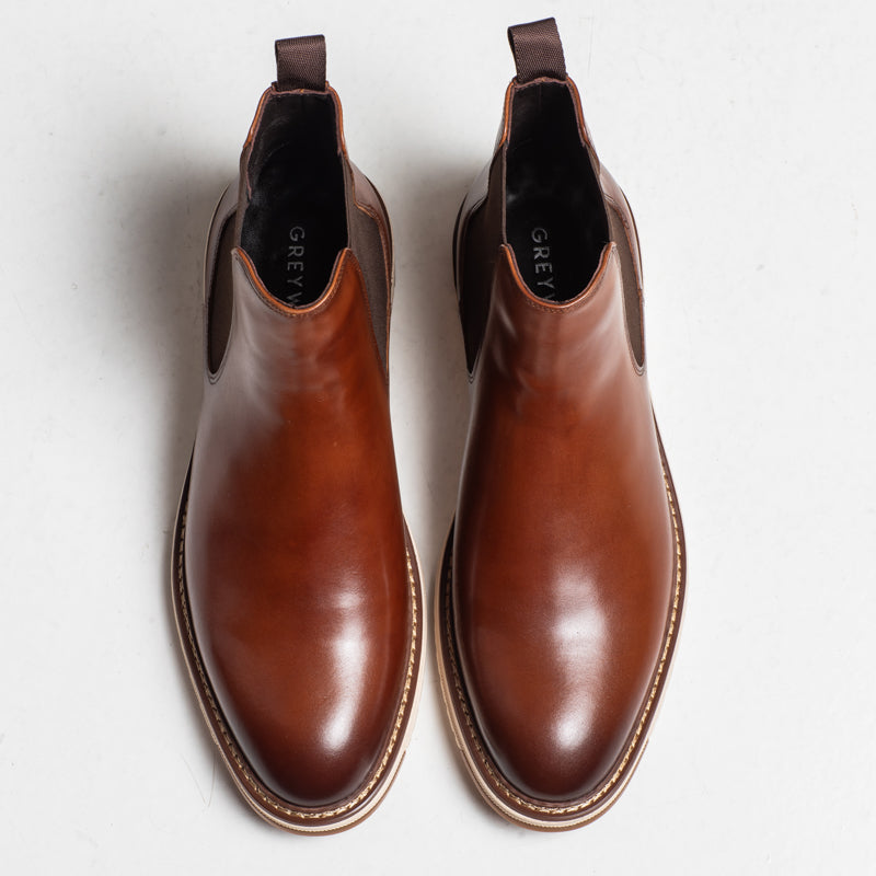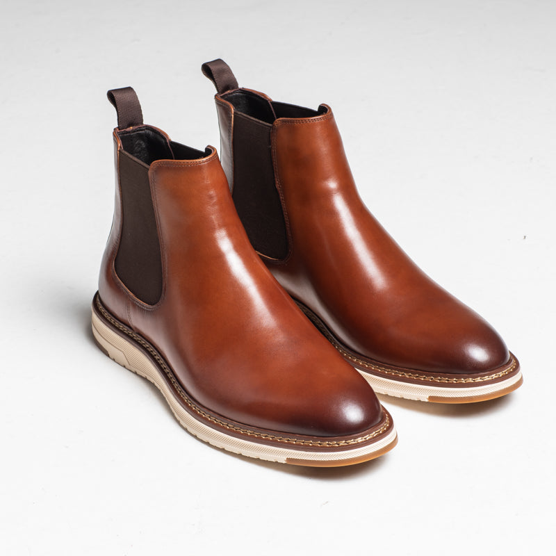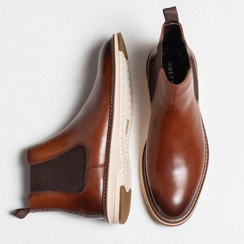 A handmade Chelsea boot crafted in polished tan leather with a clean, modern profile. December features elastic side panels, a pull tab, and a lightweight rubber sole, giving it a smart look with everyday practicality.
