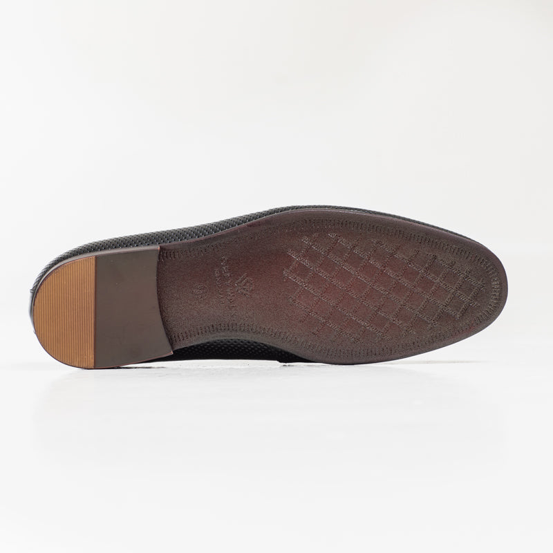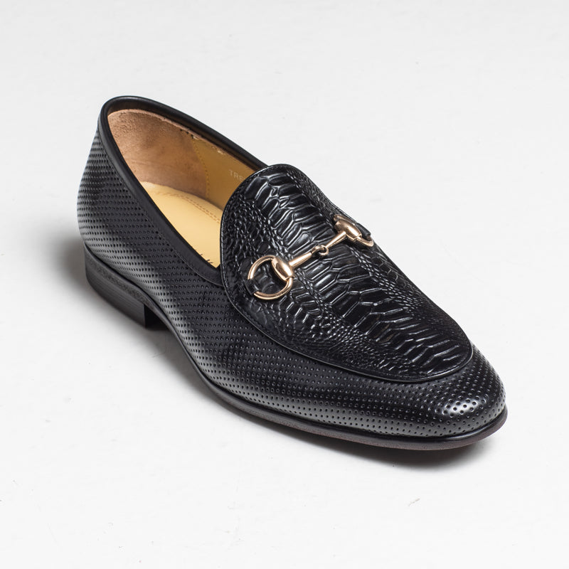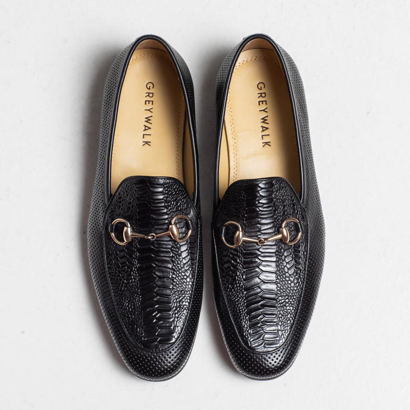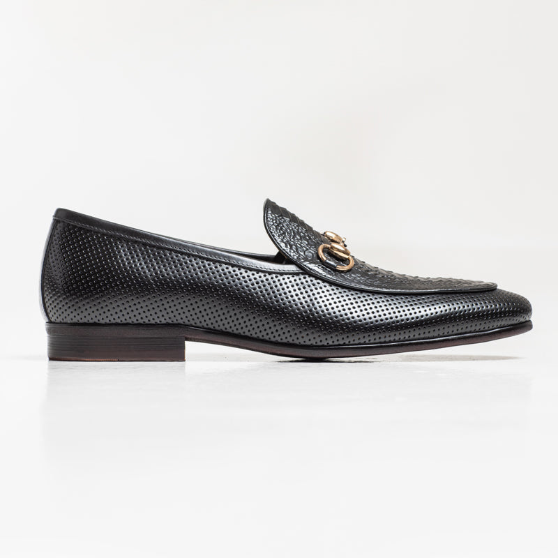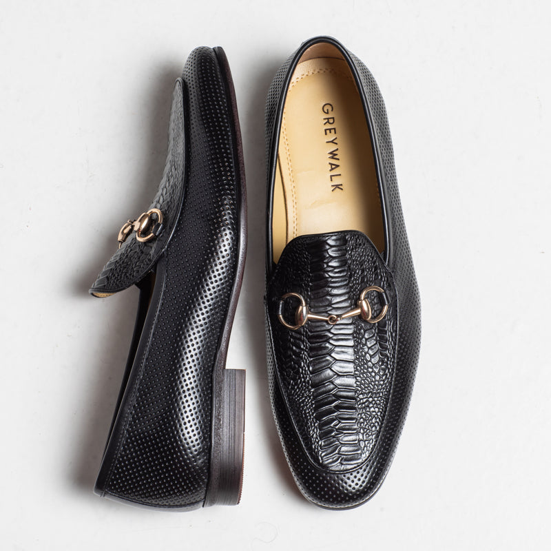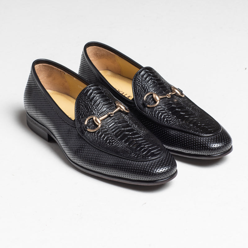A handmade loafer crafted in black embossed leather with a mix of perforated and reptile-pattern detailing. Finished with a gold-tone horsebit for a refined, statement look. Set on a lightweight rubber sole.